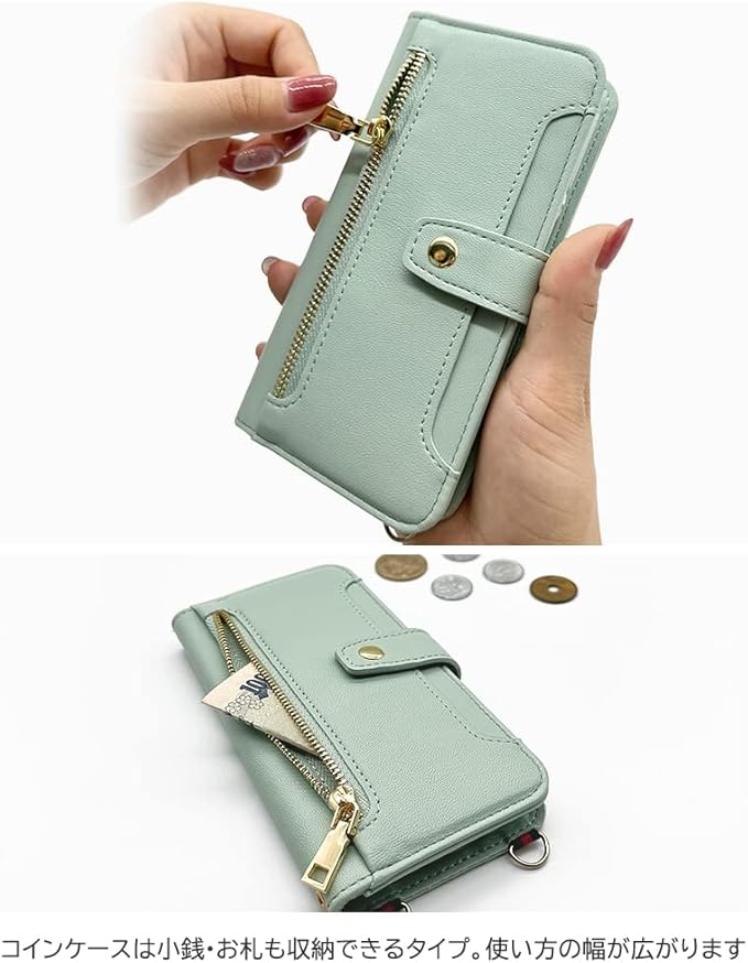 ・魅力的なファスナー式ポケット付きスマホケースです。・おしゃれで可愛い手帳型スマホケース。・小銭、お札、カードとファスナーでしっかりと収納。・マグネット留め具で、カンタンに開閉できます。・ストラップは気軽に付け外しができるフック式金具