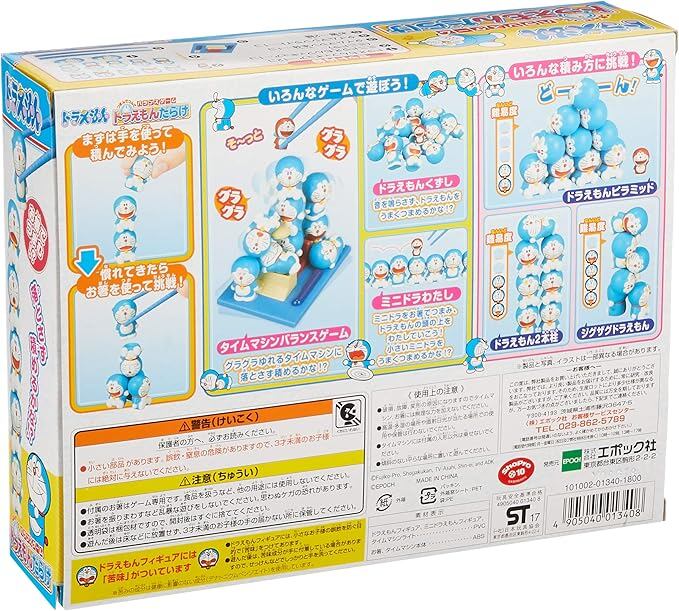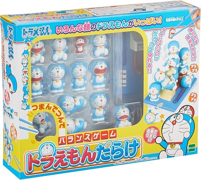 ドラえもんフィギュア 13体(内ミニドラ1体)が入った商品です。フィギュアの表情は全種異なり、様々な顔のドラえもんが入っています。フィギュアを使っていろんな積み方をさせたり、同梱のグラグラ揺れるタイムマシンでバランスゲームを楽しむこともできます。手を使って遊ぶだけでなく、付属のお箸でドラえもんをつまんで遊ぶこともできます。また、お箸を使うことで難易度調整できるので、子供から大人まで楽しめます。