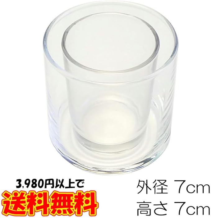サイズの異なる2種類のガラスカップをセットにしました。 ・キャンドルホルダー ガラス サークル70 フィルム付き 1個 ・キャンドルホルダー ガラス シンプル[小] 1個 写真のように重ねてセットすると左右に各0.7cmずつの隙間ができます。 上部は、ほぼピッタリの高さに揃っています。 パラフィンワックスやジェルワックスなどを使った手作りキャンドル用の材料としてオリジナルのアロマキャンドル、ジェルキャンドル、ボタニカルキャンドル作りにもご利用いただけます。 上級者は写真のようなハーバリウム キャンドルホルダーを作成することも可能です。 とにかくシンプルなガラスのキャンドルホルダー!何も邪魔するものはなくキャンドルの炎を、そのまま表現してくれます。 なのでアルミカップよりも見栄えの良いティーライトキャンドル クリアカップをオススメします。 ガラス容器のコップ、グラスなのでハーバリウムやアイデア次第で色々ご活用ください。 口径にぴったりカットされたホコリ防止フィルムが付属しております。 ・キャンドルホルダー ガラス サークル70 フィルム付き 1個 材質:ガラス サイズ(約cm): 外径 上部7 底部7 高さ7 内径 上部6.5 底部6 高さ6.4 容量(約):200ml 日本製 ※個包装箱はありません。 ・キャンドルホルダー ガラス シンプル[小] 1個 材質:ガラス サイズ(約cm): 外径 上部5.1 底部4.5 高さ6.3 内径 上部4.5 底部3.5 高さ5.7 MADE IN CHINA ※個包装箱はありません。 ご注意:サイズには測り方の差や多少の誤差があります。 ※ガラス製品に関する注意:多少の気泡やキズ、突起、曇り、色違い、薄い着色、凸凹、継ぎ目、サイズの誤差などが見られる場合があります。明らかなB品や破損の場合は無償交換しますが、このようなガラス製品の特徴である多少の不具合による返品・交換はお断りしております。予めご了承の上、お買い求めください。 直火や熱湯をかけたり高温状態で水をかけたりすると割れやすいのでお気を付け下さい。