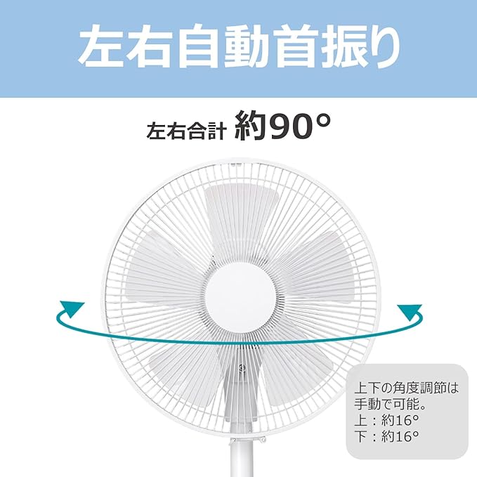 【左右自動首振り】左右自動首振りは左右合計90度、上下の角度調整は手動で上16度、下16度に調整可能。お好みの角度に調整して、快適に過ごせます。