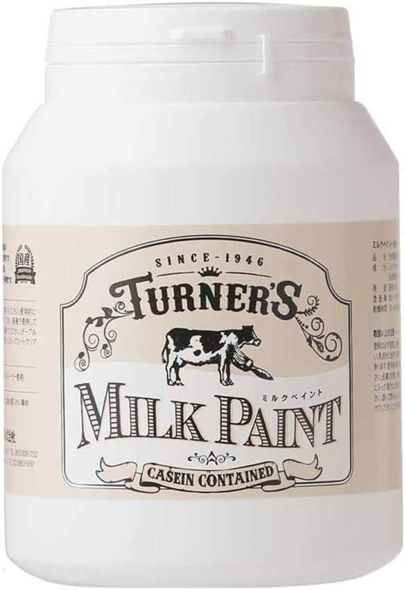 アメリカ開拓時代、ミルク原料(ミルクガゼイン)を利用した塗料で、家具などを彩色していました。その柔らかい色調が現在も好まれ、森永乳業のミルク原料を使用したターナーミルクペイントが生まれました。アーリーアメリカのやわらかい色調で、乾けば美しい落ち着いた仕上がりに。水性で取扱いも簡単です。1本で2㎡~3㎡(2回塗り)が目安です。