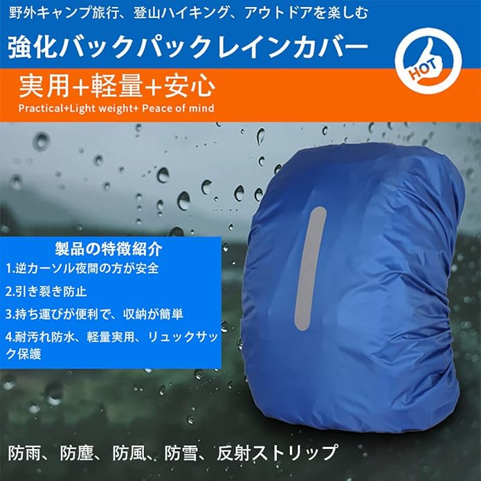 【耐久性が高い】レインカバーは高密度の210 Tナイロンの防水表面とPUコーティングを採用し、防水性と耐摩耗特性に優れ、摩擦などの傷を防止し、長持ちする。「全方位保護」:強化されたクロスバックルとゴムバンドが付属し、リュック全体をしっかり固定することができます。強風、豪雨でも大丈夫です。