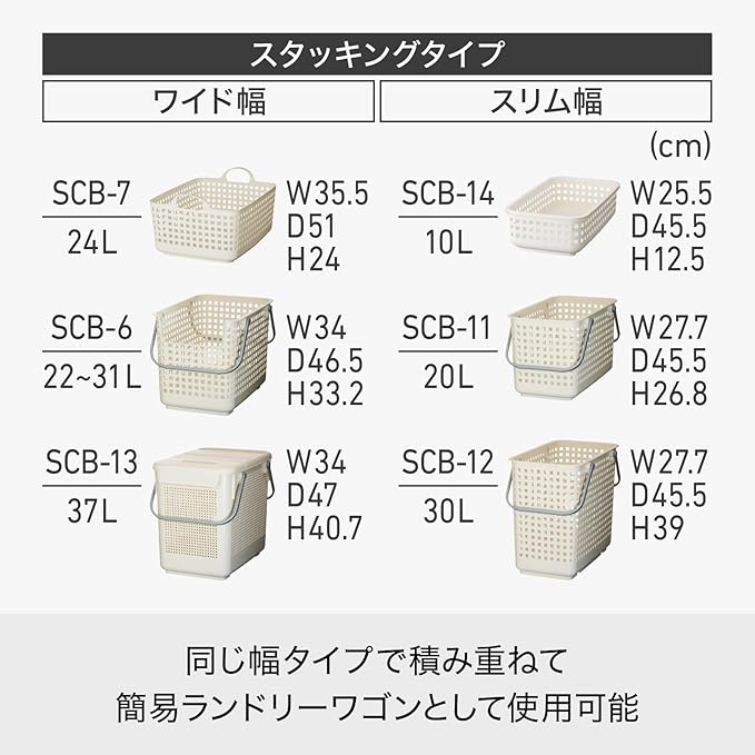 シーンによって選べる洗濯や収納に便利なバスケットシリーズ。取っ手付きで持ち運びに便利です。棚やカラーボックスの収納にも便利です。バスケットの取っ手を立てて固定することで、バスケット同士を積み重ねることができます。