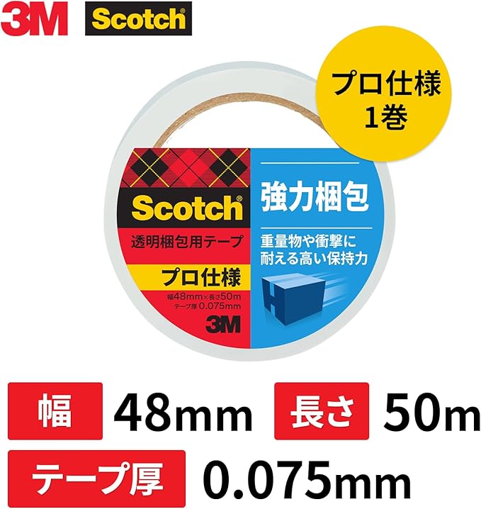 【プロ仕様の強力梱包タイプ】 重量物や衝撃に耐える高い保持力がある透明梱包用テープです。