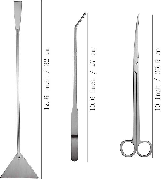 【幅広く適用】正確な剪定、再配置、維持、清掃、トリミング、水生植物の手入れ、あらゆる種類の水族館植物の世話、水槽の基板と水族館の砂利の清掃に最適です。それ以外の場合、このツールセットは、藻類スクレーパーや盆栽ツール、または爬虫類の餌付けツールとしても使用できます。手の届きにくい場所でのトリミングやピンチにも使用できます。 あらゆる種類の水族館の植物、下地、砂利、屋内庭園、その他の装飾に最適です。
