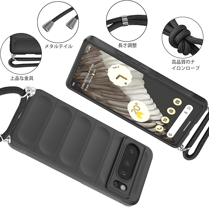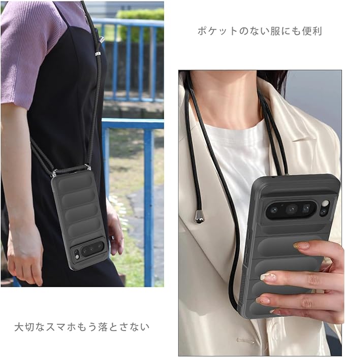 Google Pixel8 Pro ケース ネックストラップ 耐衝撃 肩掛け 斜めかけ 首掛け 縄掛け カバー グーグル ピクセル8 Pro スマホケース シリコン TPU ストラップ付き 軽量 長さ調整可能 取り外し可能 指紋防止 落下防止 衝撃吸収 ワイヤレス充電対応 Google Pixel 8 Pro カバー【縄掛け-ブラック】