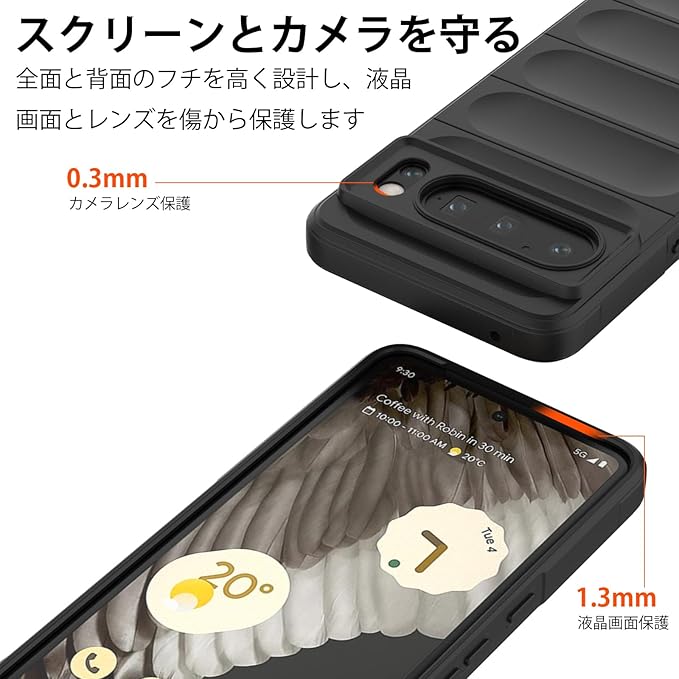 【全面保護】カメラレンズとディスプレイより Google Pixel 8 Pro ケースの保護リブが高いため、平らな場所においても、液晶画面とカメラレンズに直接触れることがなく。またケースの四隅部分にはクッションを搭載していて、スマホを落としてしまっても衝撃を最小限に抑えるケース。側面は滑り止めマットな設計で、グリップ感が有りしっかりと手に馴染みます。
