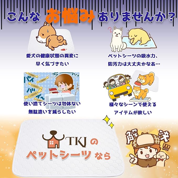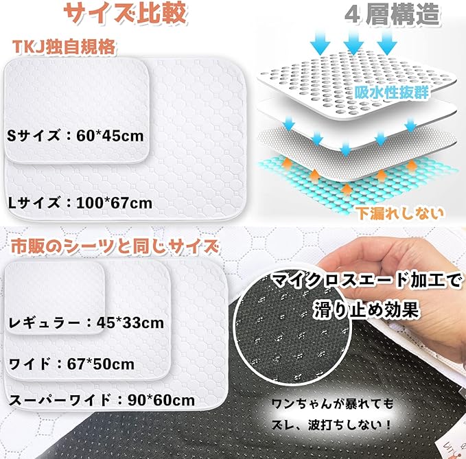 【デザイン性を備えたペットシーツ】「トイレ感」がない純白に仕上げていますので、インテリアの一部としてもおしゃれなのです。Sサイズ 60*45cm、Lサイズ100*67cm、レギュラーサイズ 45*33cm、ワイドサイズ 67*50cm、スーパーワイドサイズ 90*60cm。
