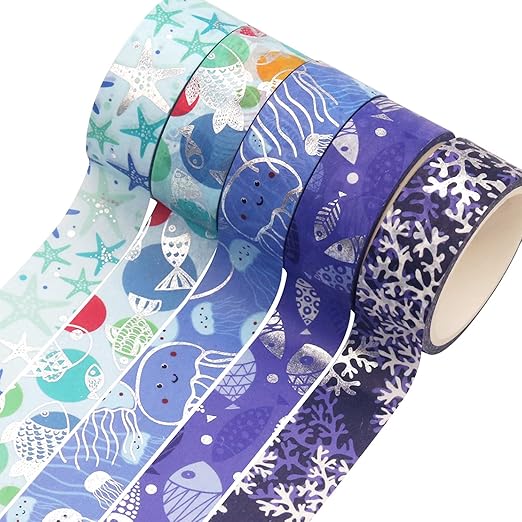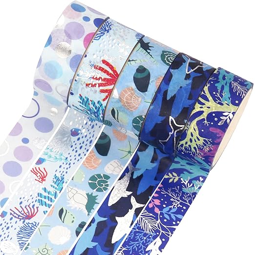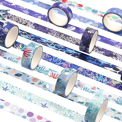YUBX マスキングテープ 10個 セット 和紙テープ 海洋 青 銀箔押し DIYクラフト ジャーナル 手帳 プラン ナー スクラップブック ラッピング プレゼント装飾