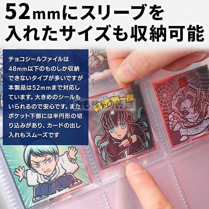 【52mmにスリーブを入れたサイズも収納可能】チョコシールファイルは48mm以下のものしか収納できないタイプが多いですが、本製品は52mmまで対応しています。大きめのシールもいられるので安心です。またポケット下部には半円形の切り込みがあり、カードの出し入れもスムーズです。