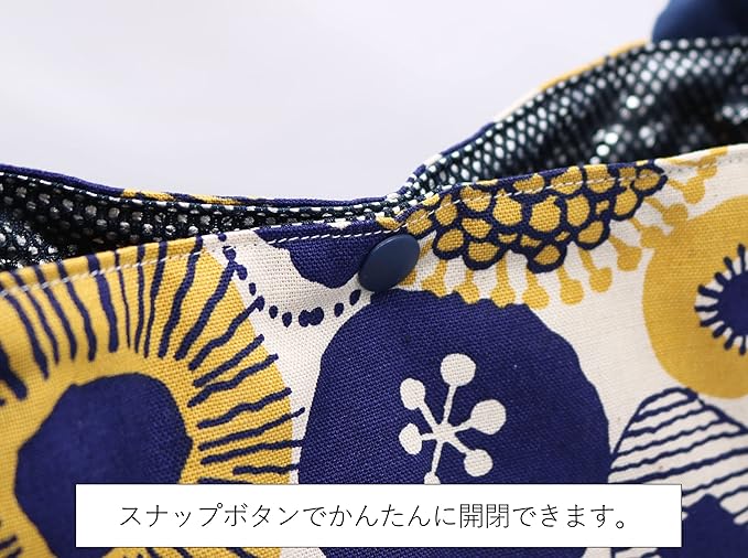 あづま袋風のお弁当袋で巾着袋のように紐がなく、紐なしの結ぶタイプです。スナップボタンで簡単に留められます。保冷保温ができるので夏は冷たく、冬は暖かく。お洗濯も可能で、生地は綿100%でサラッとしているので乾きやすく清潔に保てます。 一つずつ手作りでお作りしていますので柄の出方の違いや多少のサイズの誤差がございます。ご了承くださいませ。