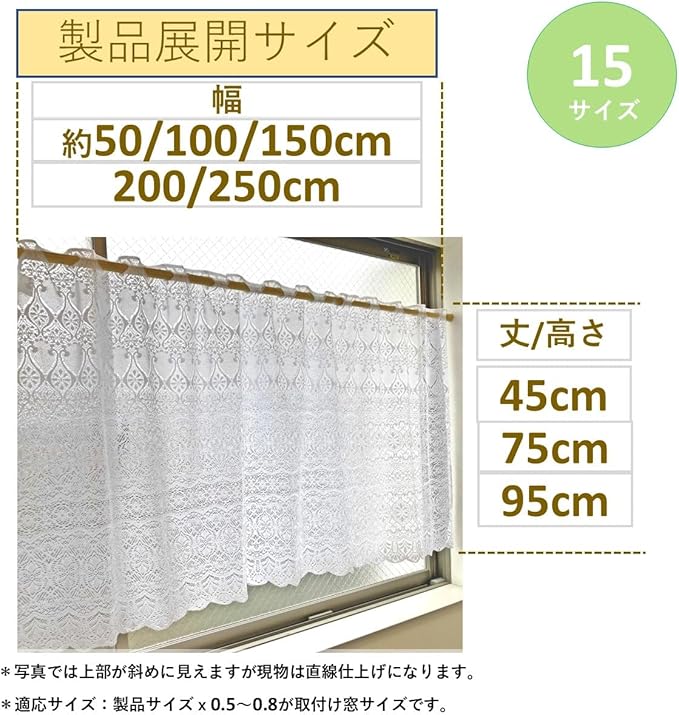 【製品・カラー・サイズ】 カフェカーテン・レトロレース ホワイト・幅150cm x 丈95cm 適応幅:75〜120cm