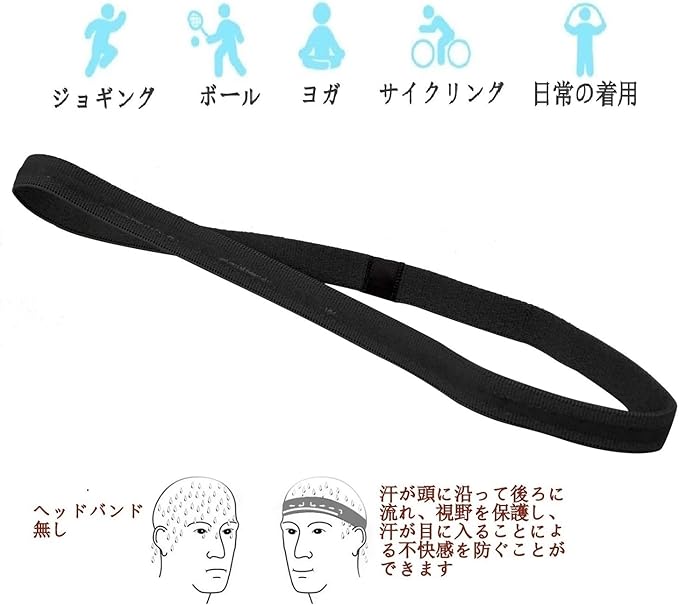 【汗止めと速乾性】:汗止めと速乾性を兼ねた高性能ヘアバンド、表面はハイクオリティ素材なので、非常に肌なじみが良いです。頭から垂れてきた汗を吸い取り素早く乾かしてくれます。また溜まった汗は頭の後方に流れていくので、視界を遮る汗も少なくなります。