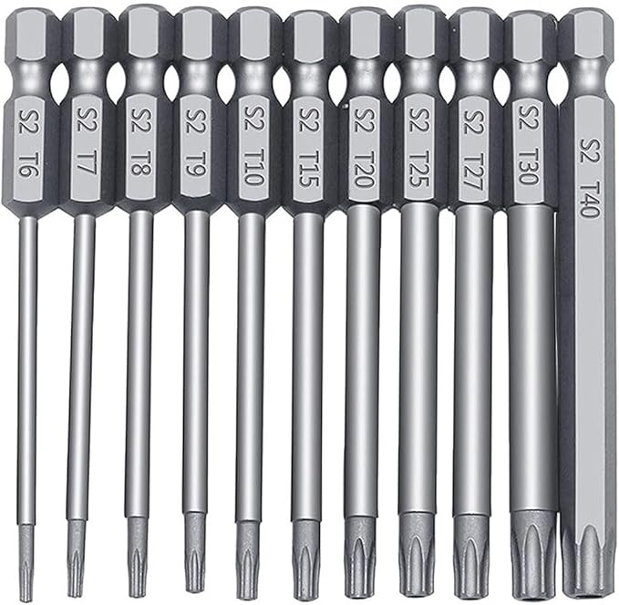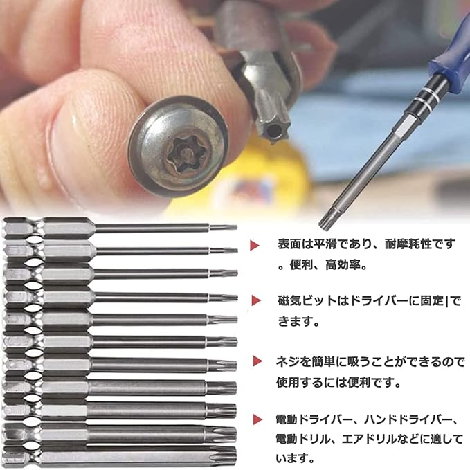 トルクスドライバー ビット 11本セット 中空トルクス頭 75mm 六角軸 6.35mm T6-T40 S2鋼ドライバービット 磁気 トルクス星ネジ用ビット工具