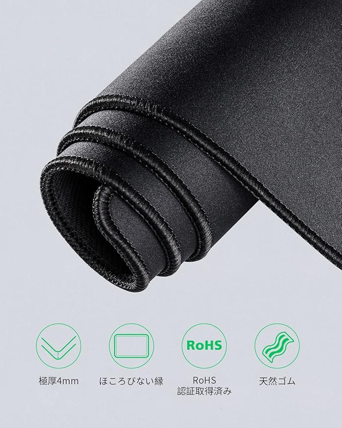 【ご注意】パソコン用大型マウスパッドは天然ゴム製であるため、開封時は少し匂いがします。空気にさらして匂いを飛ばしてからお使いください。