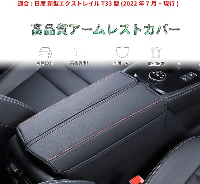 アームレストカバー適用日産 新型エクストレイル(XTRAIL) T33 SNT33 T33型(2022年7月~現行)レザー素材コンソールボックスカバー 内装 アクセサリー カスタム パーツ カー用品 汚れ防止 傷防止 専用設計 簡単取付(ブラック&グレーステッチ)