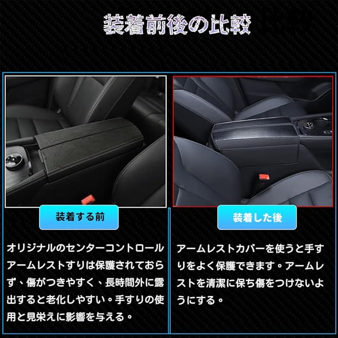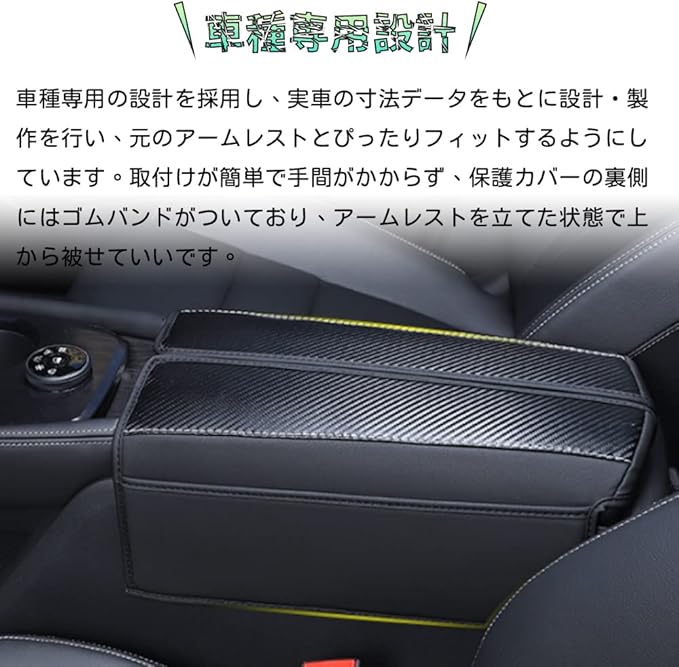 【車種専用・取付簡単】:車種専用の設計を採用し、実車の寸法データをもとに設計・製作を行い、元のアームレストとぴったりフィットするようにしています。取付けが簡単で手間がかからず、保護カバーの裏側にはゴムバンドがついており、アームレストを立てた状態で上から被せていいです。【ポケット付き】両側にはポケットが設けてありますので、ティッシュ、携帯電話、鍵、小さな手帳などの小物を保管して、さまざまなニーズを満たすことができます。