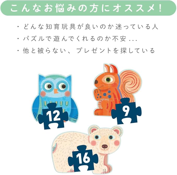 【2歳 2歳半3歳 子供向け】【はじめてのジグソーパズルに】9ピース、12ピース、16ピースの3種類の動物のパズルが入った幼児向けパズルセットです。ピースの数で難易度がわかれており、初めてのパズルにおすすめしております。