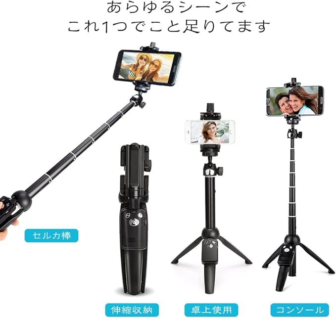 自撮り棒 三脚/一脚兼用 Bluetooth セルカ棒 リモコン付き スタンド セルフィー 無線 折りたたみ 360度回転 持ち運び便利 撮影録画 動画鑑賞 ライブ配信 iPhone Androidスマホ等対応 (ブラック)