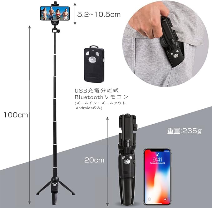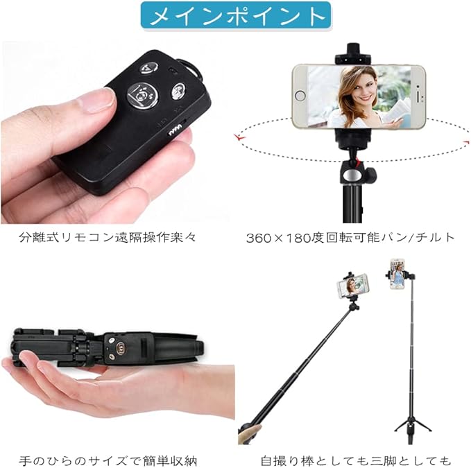 【Bluetooth分離式リモコン】本品は手持ちの使用だけではなく、Bluetoothリモコンは本体から取り外し、遠距離でコントロールできます。Bluetoothでスマートフォンと接続するだけで使用でき、約10m離れた場所でも遠隔操作が可能です。他人に依頼しなくても集団写真、自撮りなどができます。