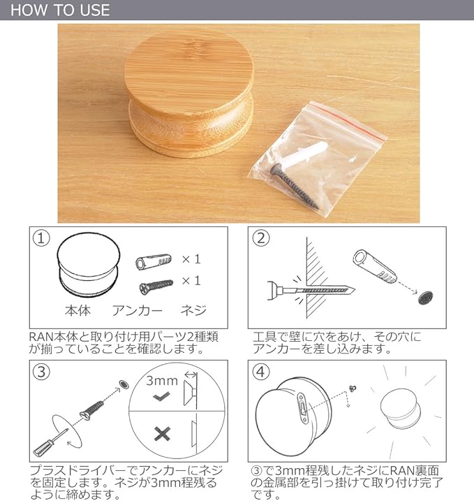 丸い形をした壁掛けフック。 すべて天然の竹製で作られています。RAN Bamboo hookの大きさは直径7cm。女性の手のひらにちょこっと載る大きさです。