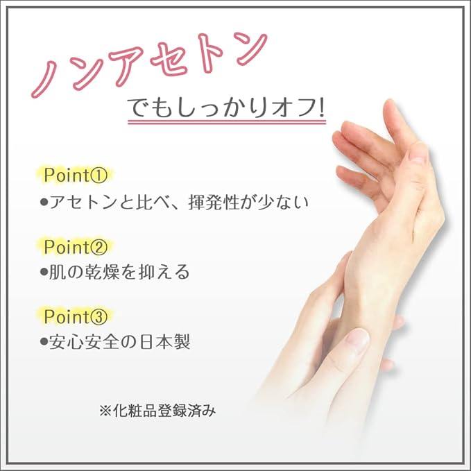 アセトンと比べ揮発性が低いアセトンフリーリムーバーです。肌の乾燥を抑え、オフ時も爪周りが白くなりにくいです。