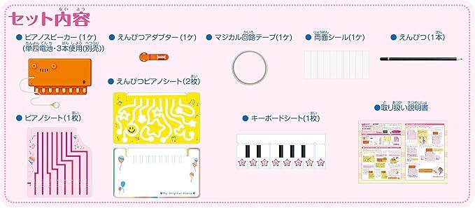 セット内容:ピアノスピーカー、えんぴつアダプター、マジカル回路テープ、両面シール、えんぴつ、えんぴつピアノシート他3種計4枚、取り扱い説明書