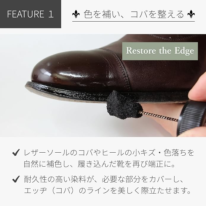 【革コバ、ヒールの傷を目立たなくする液体タイプ】補色効果で傷を目立たなくします。またコバのケバ立も抑えられます。革底靴のコバやヒールを補色する染料です。使いやすい塗布器付きタイプです。