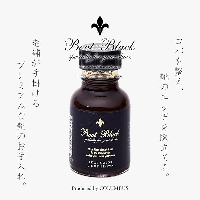 すべての皮革関連業態に90年以上の長きに渡り、靴仕上げ剤・靴クリームを提供してきた株式会社コロンブスが、その知識と開発力を結集して作り上げた、ジャパンメイドのブランド"Boot Black"シリーズ。靴がその存在感を主張し始めた昨今、お客様一人一人のご要望を具体化し、オリジナルな靴を作り上げるために活動している当社"トップシャイニスト"の独自の判断基準を採用し、「磨きのプロ達」が創りあげた、それが"Boot Black"シリーズです。