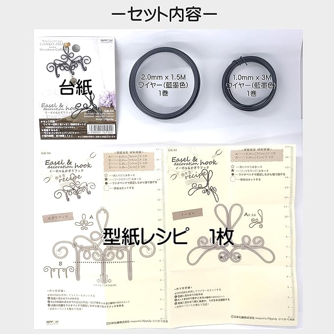 セット内容:2mm 1.5m巻ワイヤー1個、1.0mm 3m巻ワイヤー1個、型紙レシピ1枚