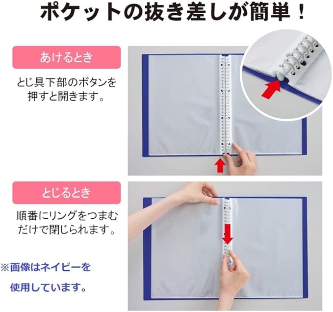 【材質】表紙・ポケット/ポリプロピレン(表紙生地厚0.75mm)、とじ具/ポリカーボネート・ポリプロピレン