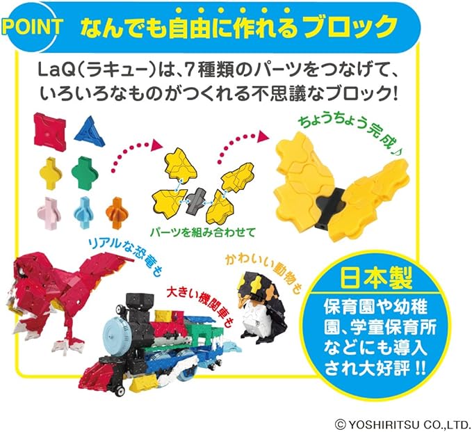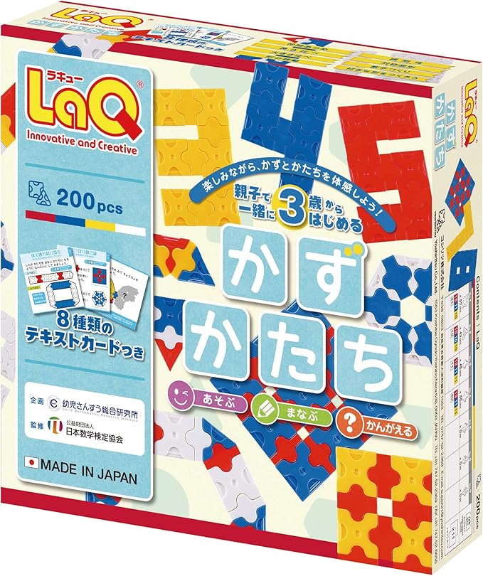 LaQパーツと付属しているテキストカードを使って、親子で「算数」を楽しむセットです。LaQで遊びながら図形感覚を育て、形の構成力を身につけます! 平面図形問題を中心に「長さ比べ」「大きさ比べ」「対称図形」など、8種類のテーマを掲載! 形の構成力を学びながら、親子で一緒にかずとかたちを体験し、小学校に入ってから困らない算数力を身につけよう! ※親子と一緒に遊んで下さい。 身につく3つのポイント! 【Point1】順序立てて組み立てることで理論的思考力が身につきます。 【Point2】親子や友達といっしょに作ることでコミュニケーション力が育ちます。 【Point3】小学校に入ってから困らない算数力が身につきます。