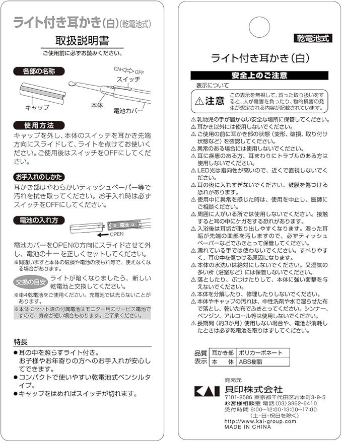 【家族の耳掃除がしやすいライト付き】子どもや介護の必要がある人の耳掃除をする際に便利な耳かき。耳の中を傷つけずに汚れをキャッチしやすいよう、先端にライトを付けました。