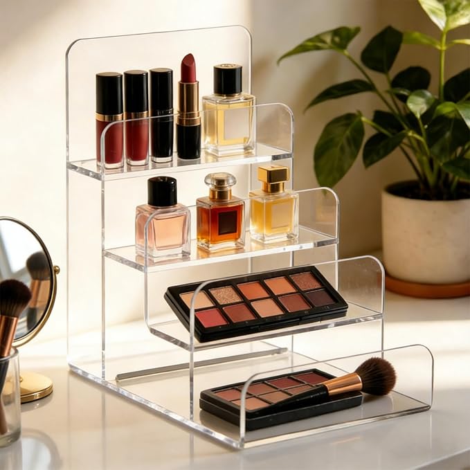 【透明アクリルディスプレイスタンド】メイク用品、スマホ、化粧品などの小物を収納。すべてのアイテムをクリアにディスプレイできます。
