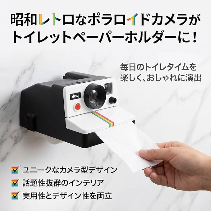 【昭和レトロなポラロイドカメラ型デザイン】トイレットペーパーホルダーが懐かしいカメラ風に大変身!虹色ストライプの先からペーパーが写真のように出てくるユニークなギミックで、トイレ空間を一気におしゃれに演出します。