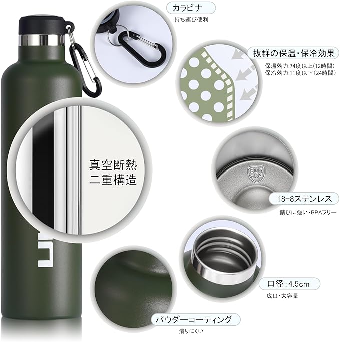 【広口・大容量】口径:4.5cm、容量:750ml/1000ml。アウトドアにはもちろん、室内での水分補給もしっかりとれます。持ち運びに便利なカラビナ付きなのでオフィス・自宅・学校用の水筒や部活、スポーツ、外での営業仕事や移動が多い方にもおすすめです。