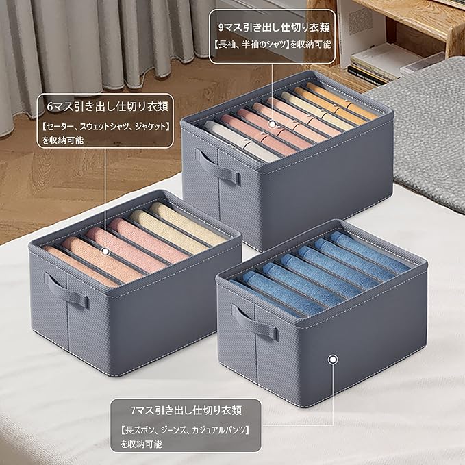 【サイズと使用】収納ボックス 9マス引き出し仕切り衣類 (9マス:44 30 20cm、収納幅4.8cm、ハンドル付き) Tシャツ、長袖シャツと半袖シャツを 収納可能。7マス引き出し仕切り衣類 (7マス:44 30 20cm、収納幅6.2cm、ハンドル付き) スカート、長ズボン、ジーンズ、カジュアルパンツを収納可能。6マス引き出し仕切り衣類 (6マス:44 30 20cm、収納幅7.3cm、ハンドル付き) ブラジャー 収納、セーター、スウェットシャツ、ジャケットを収納可能。着用したいものが一目でわかる、整理の時間を50%削減します、素敵な一日を始めよう。