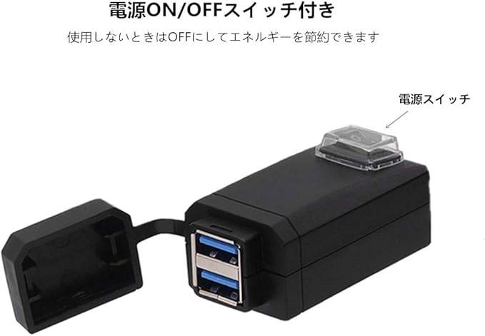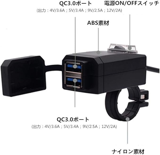 SHEAWA バイク USB電源 USB充電器 QC3.0 USB2ポート 電源ON/OFFスイッチ Quick Charge 3.0 防水カバー ハンドルやサイドミラーに取り付け可能