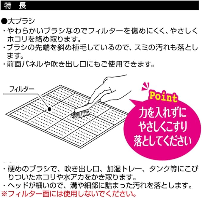 ●小ブラシは硬めのブラシで吹き出し口・加湿トレー・タンク等にこびりついたホコリや水アカをかき取る