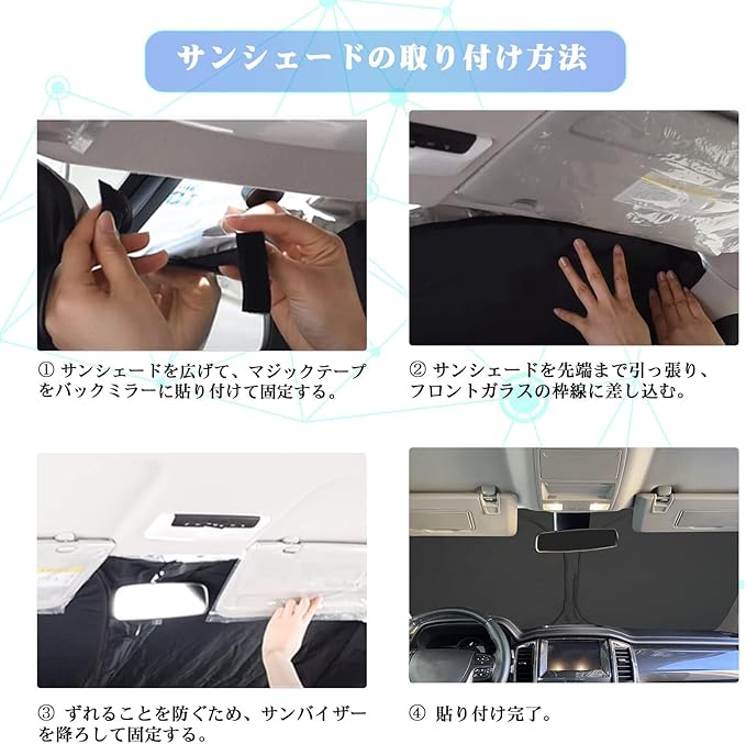 「品質保証」:一般品より2倍以上の厚さで、耐久性が高くて、遮光性や断熱効果がもっと保証されます。4層構造高密度反射生地を採用。巧妙な設計で設置しやすいです。そして傘式より使い勝手がよくて遮光性がいいです.