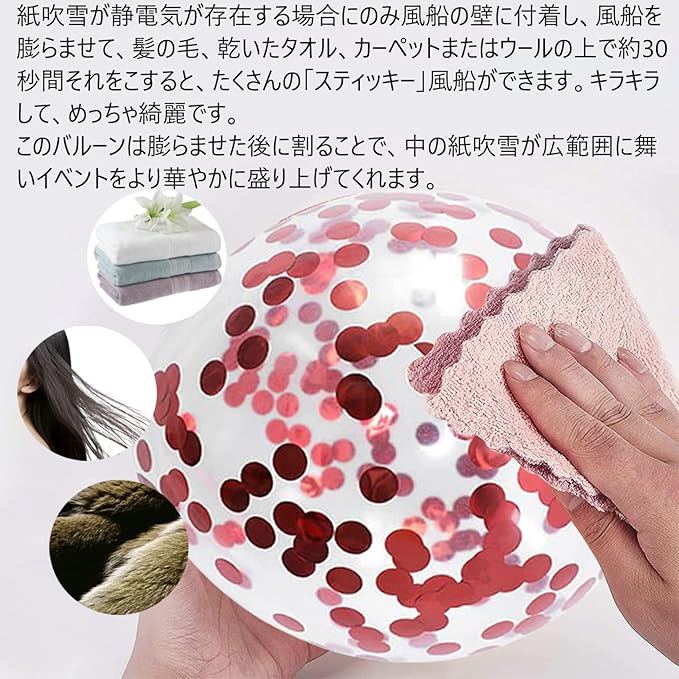 【注意事項】①膨らませる前に風船を伸ばして、膨らませた後に丸い風船ができるようにします。②過充填しないでください。③日焼け、過熱、鋭利なもの、過度の摩擦を避けてください。④膨張後、一定の色の違いが現れますが、色の効果はより良くなります。 【返品、交換について】配送途中の破損などの事故がございましたら、当社まで連絡下さい。破損部分等 画像を送っていただければ確認後、交換または返金いたします。