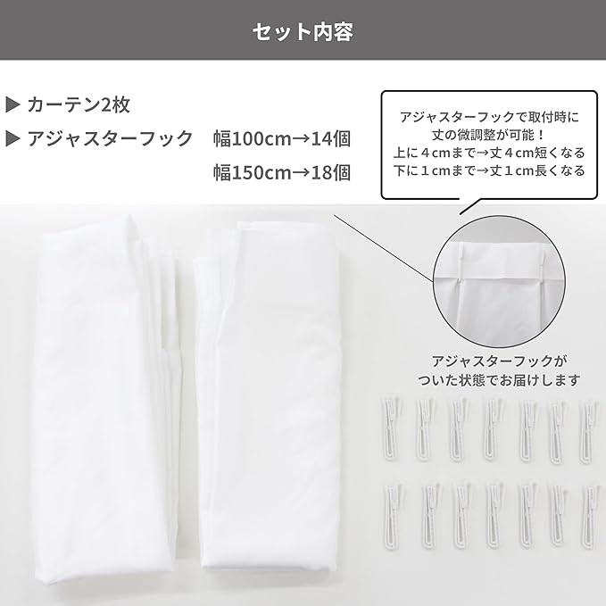 カーテン2枚にアジャスターフックが14個付属しているので、届いてすぐお使いいただけます。
