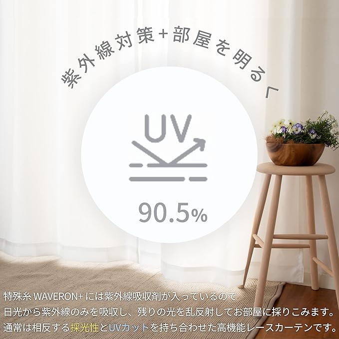 採光性でお部屋が明るくなるにもかかわらず、糸が紫外線を吸収してくれるのでUVカット率は90.5%。お肌とお部屋の日焼け防止におすすめです。