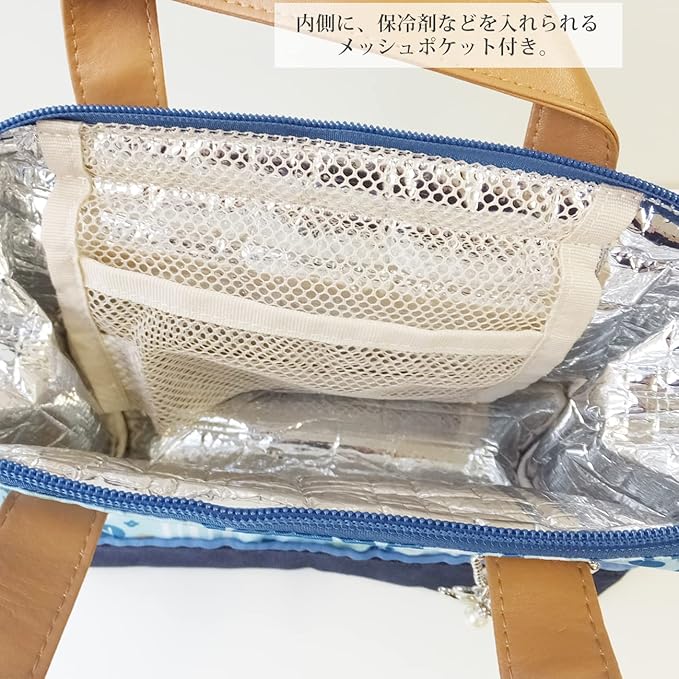【内側はアルミフィルム】内側の素材はアルミフィルムで保冷保温使用。保冷剤などを入れるのにぴったりのメッシュポケットが付いています。