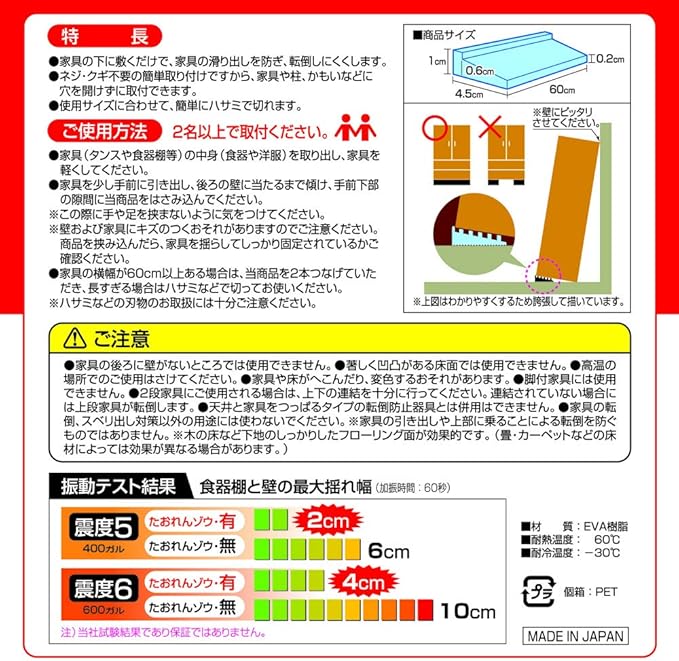 家具の下に敷くだけで、家具の滑り出しを防ぎ、転倒しにくくします。