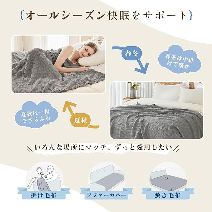 【通気性でいつでもサラサラ】肌をやさしく包んでムレをこもらせない「通気性」がガーゼの特徴です。寝苦しい夏の夜もさらりとした寝心地です。体が冷えすぎたときは、薄い6枚の空間にほどよく体温をため込んで寝冷えを防いでくれます。 寝入りばなは涼しくて、朝方、気温が下がってきたら体を冷やしません。