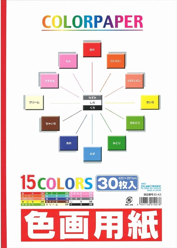 エヒメ紙工 色画用紙 A3サイズ 15色 30枚 EI-A3