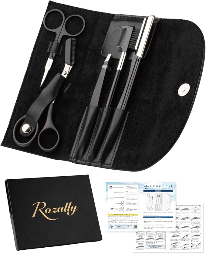 【セット内容】 「 眉毛はさみ、クシ付き眉毛はさみ、毛抜き、クシ付き眉毛ブラシ (コーム)、カミソリ、ブラックレザー収納ケース、フルカラー説明書 」の合計7点セットになっております。1つ1つの器具の使い方を説明書に詳しく解説し、どの手入れでどのように器具を使用していくのか、イラスト25枚を用いて丁寧に記載を行なっております。