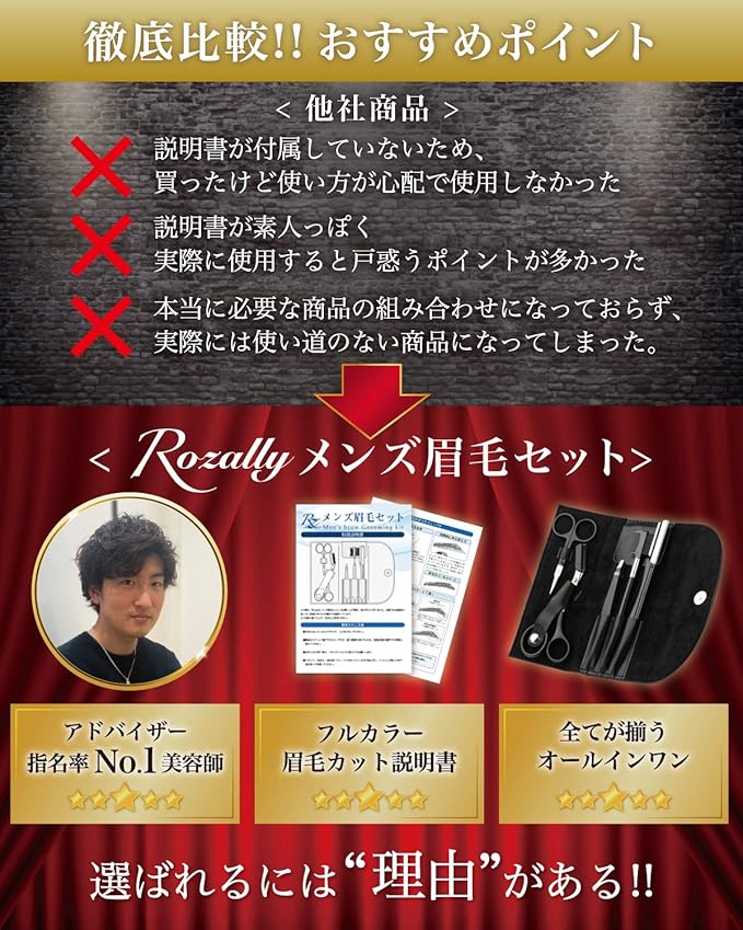 【こだわり】様々なメーカーからメンズに向けて” まゆげ ハサミ ”や” まゆげ セット ”が販売されていますが、Rozallyの眉毛セットは”オールインワン”と”初心者でも使える”という点にこだわりました。美容系を取り扱っている20社以上の工場からサンプルを取り寄せ、細かな改良に対応して頂けた1社でのみ製造を行なっております。