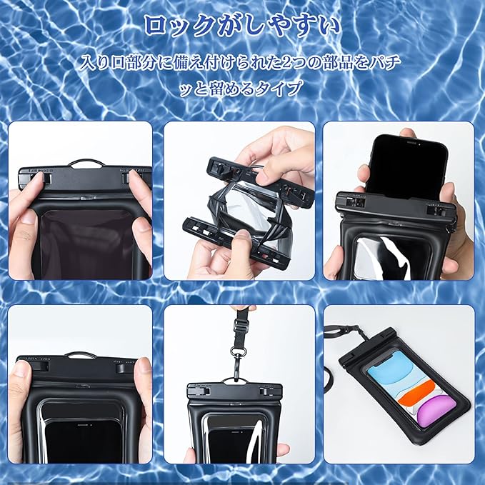 スマホ 防水ケース 海 【水に浮くタイプ/指紋/Face ID認証】スマホケース IPX8認定 水中・水上で操作できる 良いタッチ感度 顔認証 ロックがしやすい サイドボタンが押しやすい ストラップ付き 首掛け 高透過率 7インチ以下全機種対応 防水カバー 水中撮影 お風呂 釣り 海 海上アスレチックパークなど適用(水に浮くタイプ)ブラック